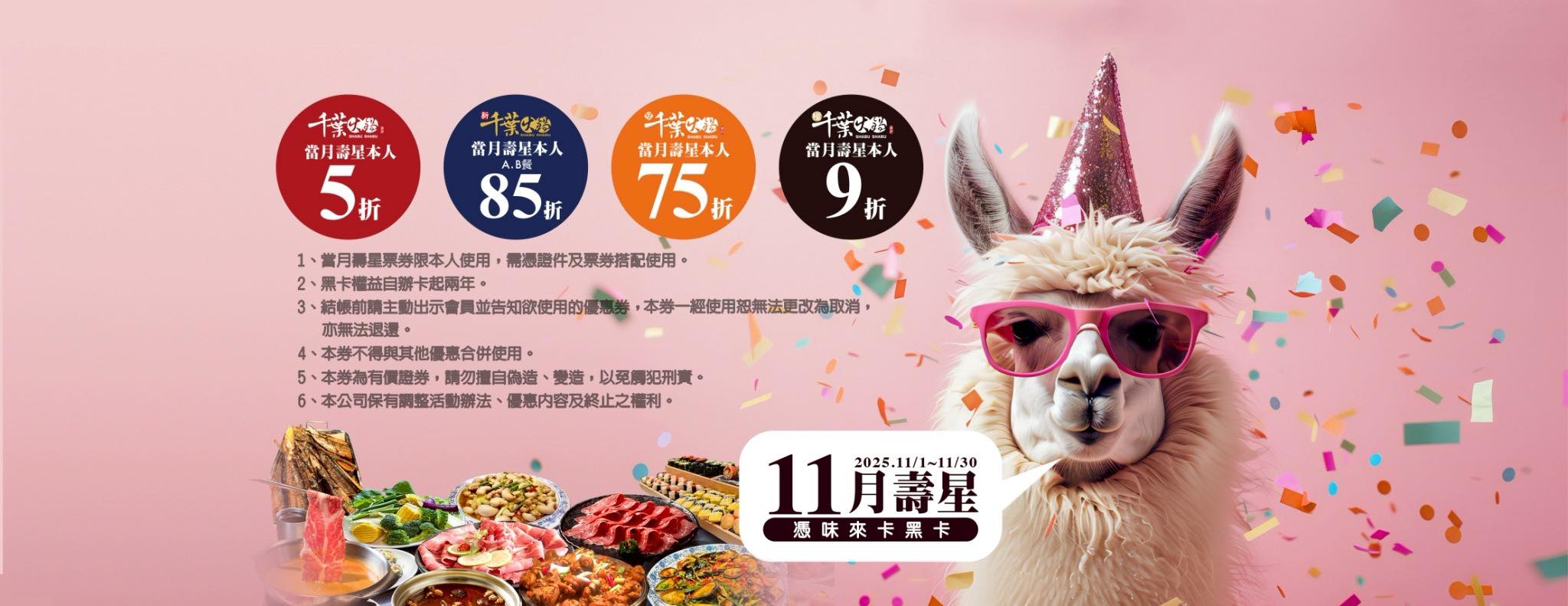 瀏覽數 10893 次 優惠期間 2025-11-01 至 2025-11-30 優惠倒數 資料來源 商家網站(按此前往) 優惠分類 台中餐廳 高雄餐廳 憑黑卡消費-當月壽星本人75折憑金卡消費-當月壽星本人85折憑普卡消費-當月壽星本人9折 GO 商家網站看最新優惠 本網站所刊登之壽星優惠訊息,以店家官網或現場公告為準!*因各家行銷活動更新快速,本站提供的優惠活動分享資訊,可能有發生非同步的情況,也歡迎店家主動通知,感謝各方體諒!