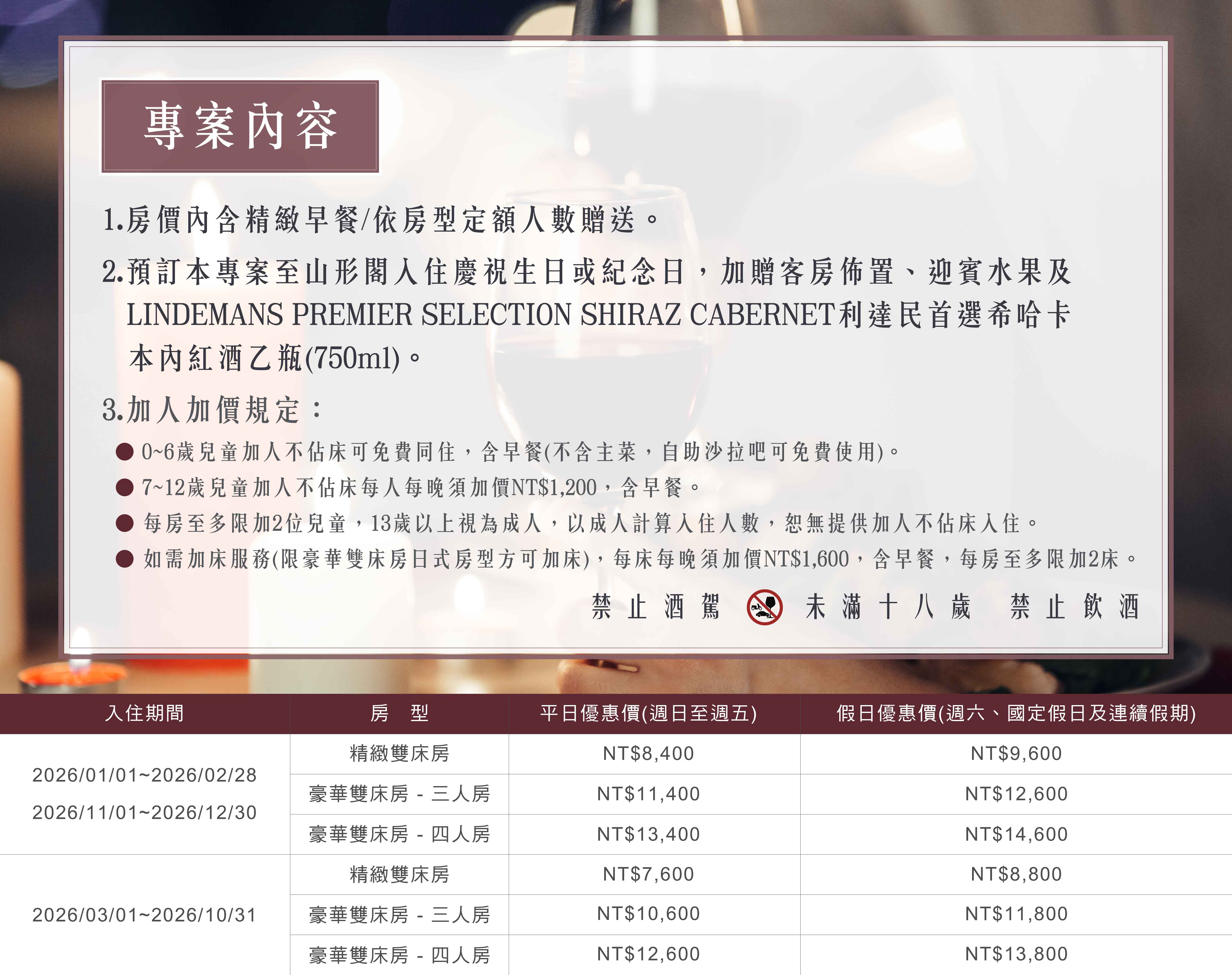 - 本專案限於入住日三天前透過官網或電話預訂,以利妥善安排。