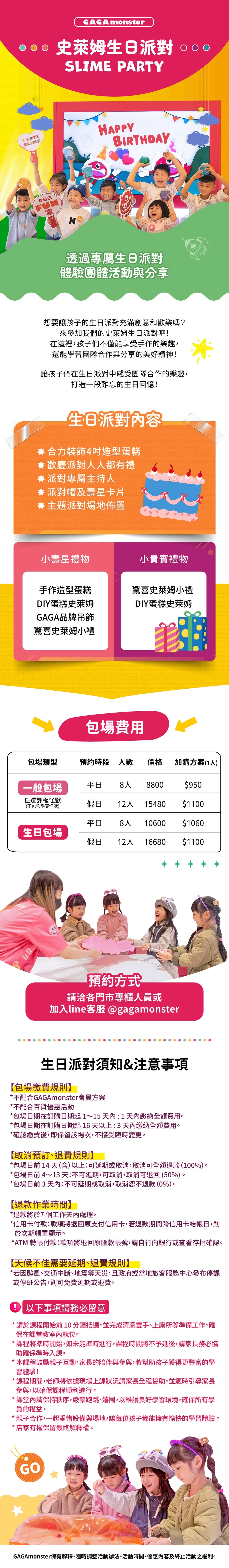 瀏覽數 4657 次 優惠期限 未註明截止日期,請參閱商家網站 優惠倒數 資料來源 商家網站(按此前往) 優惠分類 台北休閒娛樂 新北休閒娛樂 新竹/竹北休閒娛樂 台中休閒娛樂 高雄休閒娛樂 生日派對內容史萊姆蛋糕: 孩子們可以合作製作專屬的 4 吋史萊姆造型蛋糕。創意分享: 與好友們一同享受史萊姆創作的樂趣。專屬禮物: 小壽星與所有參與的朋友都能獲得獨一無二的小禮物。 GO 商家網站看最新優惠 本網站所刊登之壽星優惠訊息,以店家官網或現場公告為準!*因各家行銷活動更新快速,本站提供的優惠活動分享資訊,可能有發生非同步的情況,也歡迎店家主動通知,感謝各方體諒!
