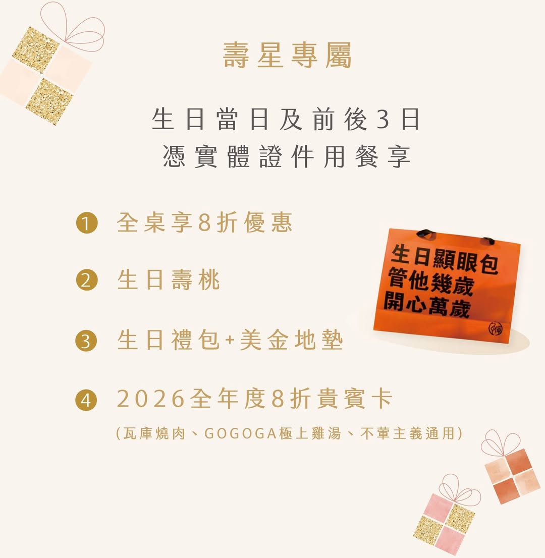 瀏覽數 10891 次 優惠期間 2026-01-01 至 2026-12-31 優惠倒數 資料來源 商家網站(按此前往) 優惠分類 台中餐廳 壽星活動:生日當日及前、後三日憑證件用餐8折優惠壽星 享4重好禮 生日當日及前、後3日憑實體證件用餐全桌8折 生日壽桃 生日禮包+美金地墊2026全年度8折貴賓卡 更多資訊與注意事項 瓦庫燒肉台中市中區民權路16號04-22231188 GO 商家網站看最新優惠 本網站所刊登之壽星優惠訊息,以店家官網或現場公告為準!*因各家行銷活動更新快速,本站提供的優惠活動分享資訊,可能有發生非同步的情況,也歡迎店家主動通知,感謝各方體諒!