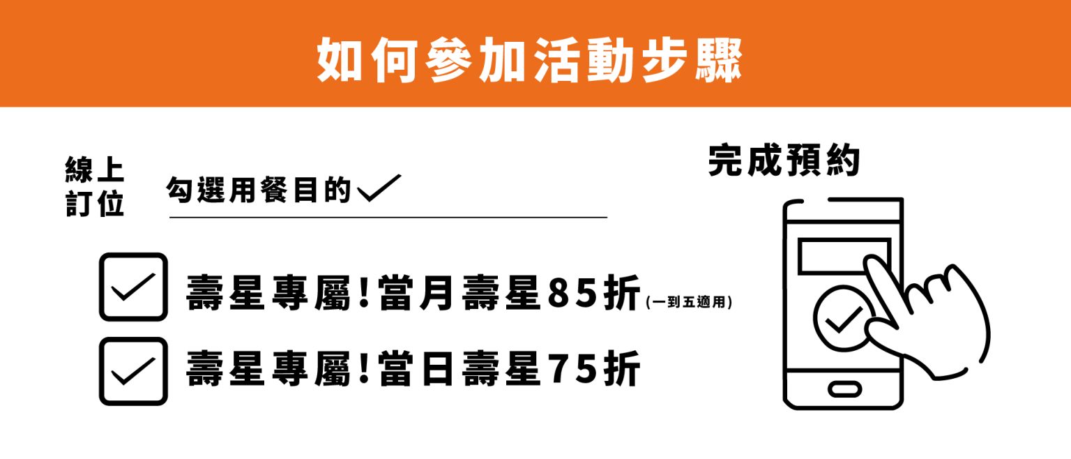 - 壽星本人請用透過線上預約並勾選活動按扭【壽星專屬!當日壽星75折】或【壽星專屬!當月壽星85折(一到五適用)】才可享有福利!